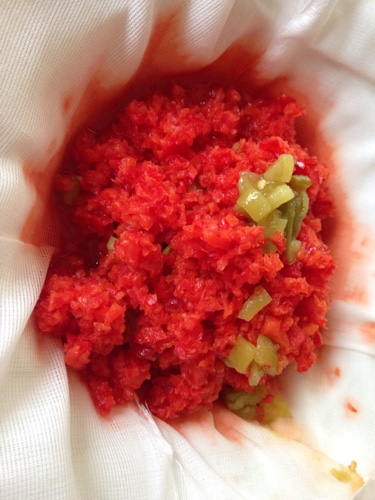 Transfer the red peppers into a cheese cloth (or kitchen towel) over a bowl. Add in the canned chili peppers at this time. I added about half a can to keep it from being too spicy. You can add more or less to adjust the spicy level.
