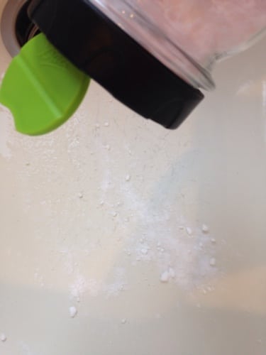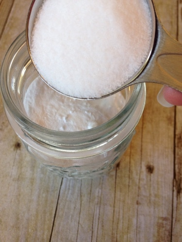 I start by adding about two cups of baking soda to a canning jar. Then I add two tablespoons of salt. Both the baking soda and salt are abrasive to help clean better. If you are concerned about scratching your sink you can also use just baking soda.