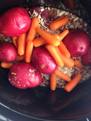 Then, add 1 package of powdered onion soup on top of the roast. I just use the Aldi brand of powdered onion soup. Add your veggies on top, we like baby carrots and red potatoes.