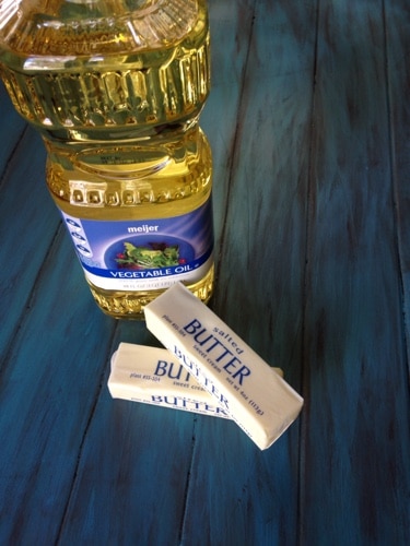 You will need one cup of butter and about 3/4 cup oil. I used vegetable oil in mine to keep the cost down, but you can use olive oil too. Let the butter sit out for a couple of hours until it is nice and soft.