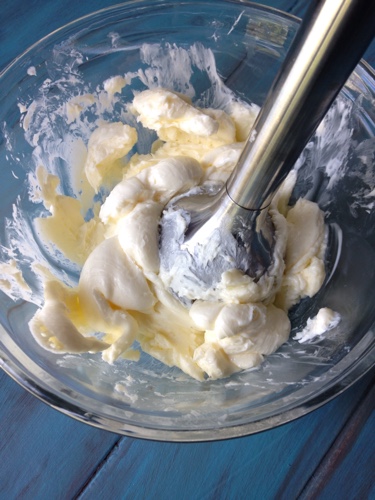 Place the butter in a bowl and use an immersion blender to get the butter whipped. Then add about 3/4 a cup of oil. You can add a little more or less depending on how spreadable you would like it.