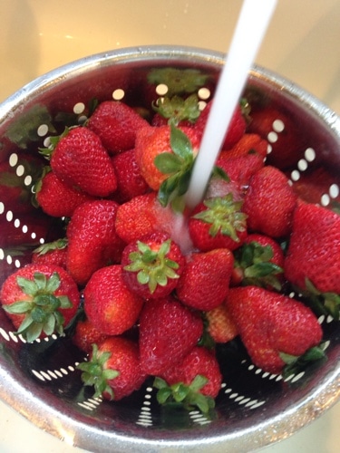 You will need about two pounds of fresh strawberries. Wash the strawberries and then cut the stems off.