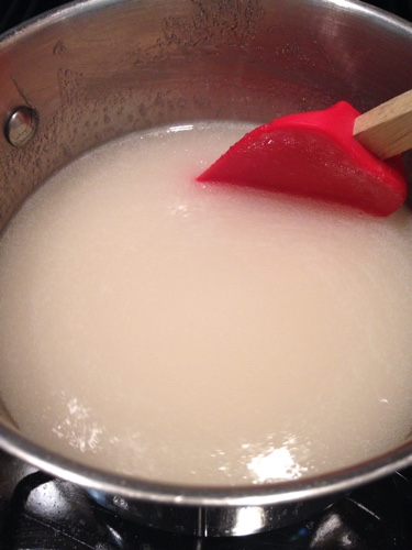 Mix 1 package of pectin, 4 cups of sugar and 1 cup of water in a large pot. Cook on medium heat stirring constantly until boiling. Cook for one minute and then remove from heat.
