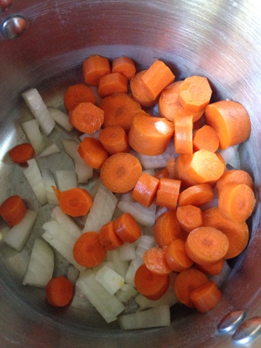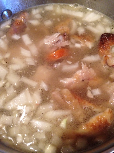 Start by chopping up some onions and carrots. I use 1 onion and 2 carrots for every chicken. Add them to a big pot. Then add a 1/8 tsp. of black pepper and a bit of salt.
