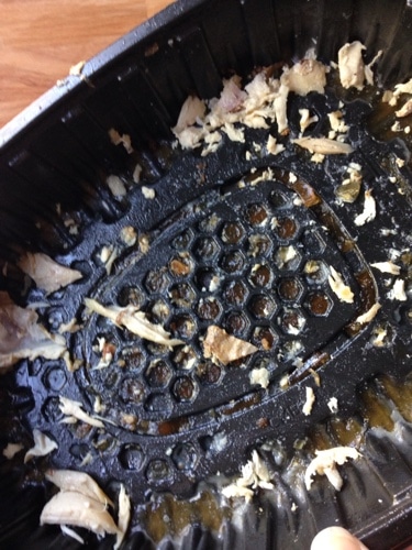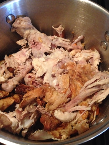 Fill the pot up with water until the chicken is covered. I like to use the container that the chicken came in to get all of the little bits of yum from the chicken.