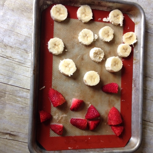 Once you have the food ready to be flash frozen lay it out on a baking sheet. I like to line mine baking sheet with a Silpat pad. You can use wax paper, but a Silpat pad can be used over and over again. Make sure none of the food is touching and place in the freezer for 1-2 hours.