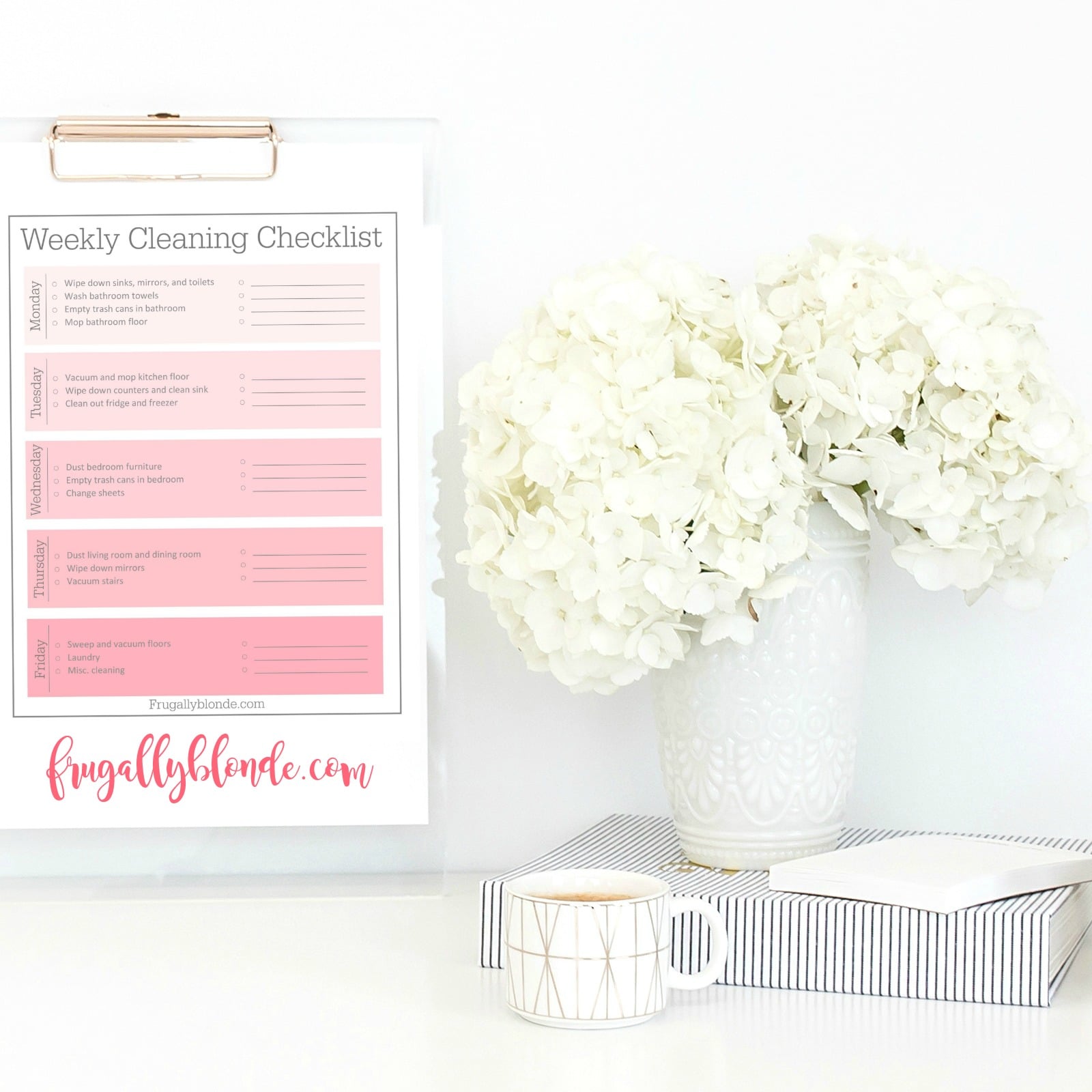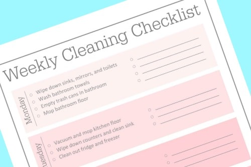 Your house may never be perfectly spotless but with this weekly cleaning schedule printable you will never have to spend the whole day cleaning again. You can set up a routine and know the right cleaning tips and tricks to get it clean the first time. You can sign up (free!) to my newsletter and get the weekly cleaning checklist for free.